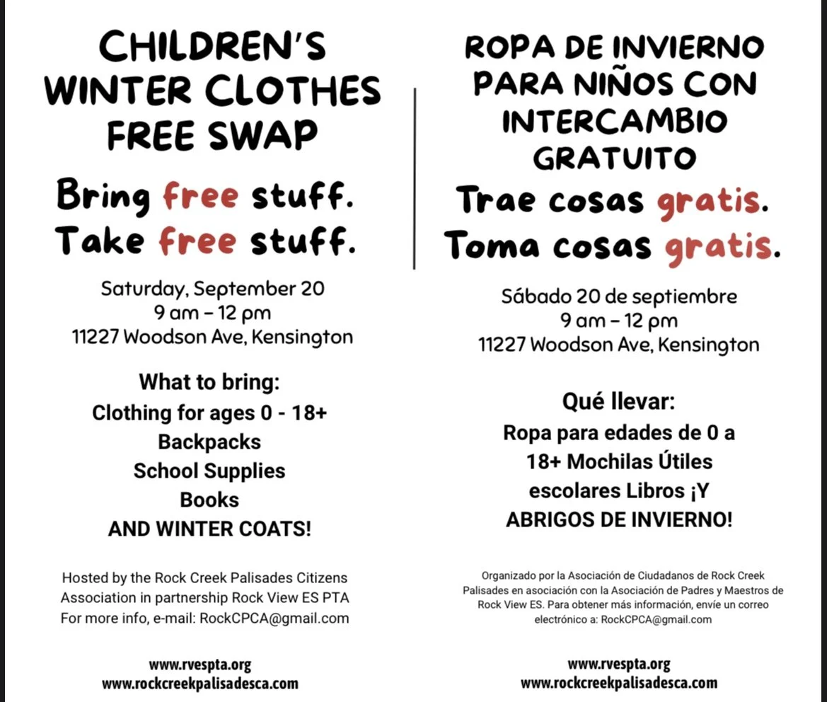Children’s Winter Clothes Free Swap Saturday, September 20, 2025 9:00 AM 12:00 PM 09:00 12:00 11227 Woodson Avenue Kensington, MD, 20895 United States (map) Google Calendar ICS